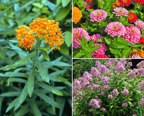 • Nectar plants 🌸 (zinnias, coneflowers, lantana, verbena, butterfly bush) feed the adult butterflies.